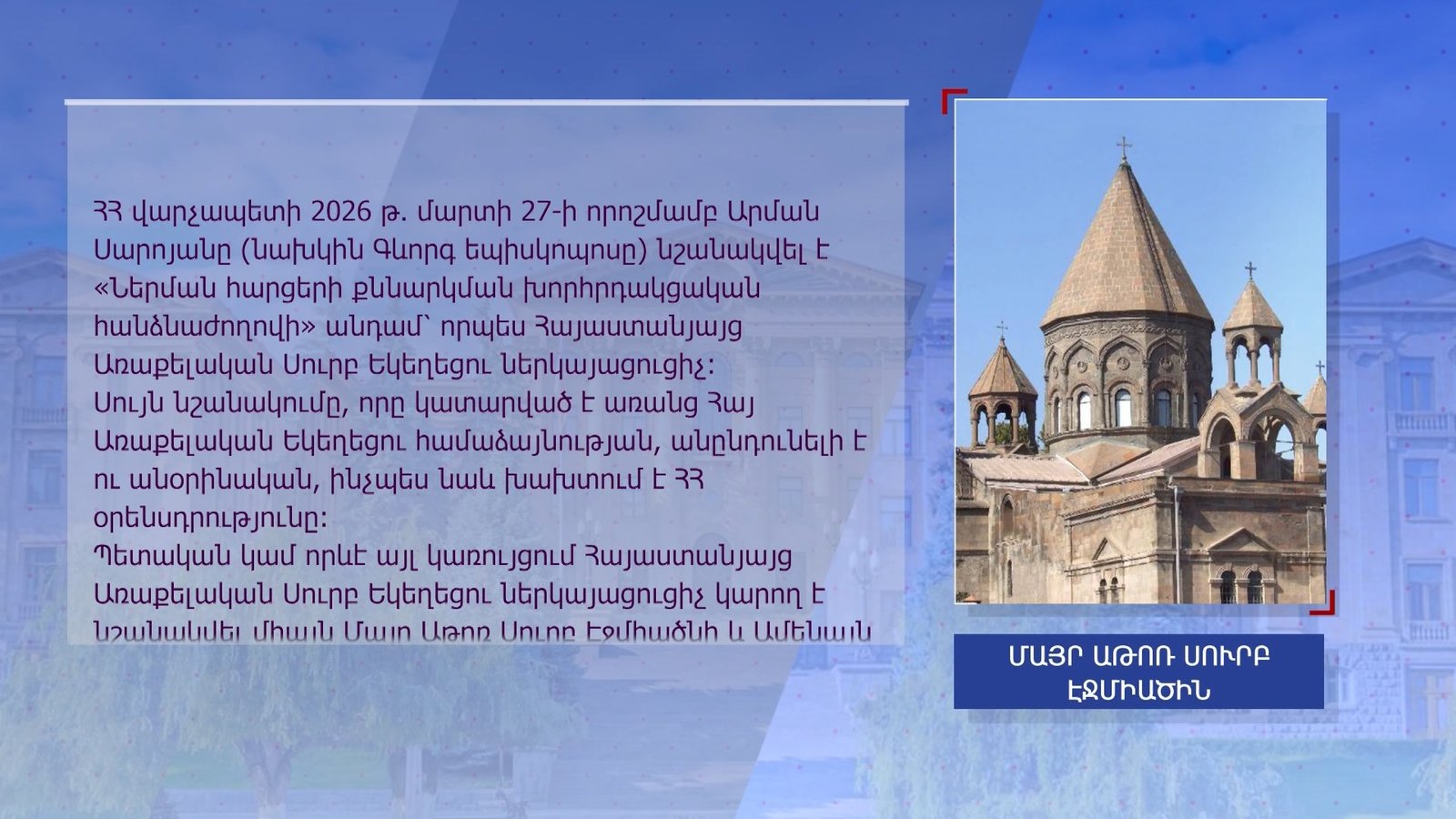 Արման Սարոյանը նշանակվել է «Ներման հարցերի քննարկման խորհրդակցական հանձնաժողովի» անդամ՝ որպես Հայաստանյայց Առաքելական Սուրբ Եկեղեցու ներկայացուցիչ։ Մայր Աթոռը հայտարարել է, որ նշանակումը կատարվել է առանց Հայ Առաքելական Եկեղեցու համաձայնության և խախտում է ՀՀ օրենսդրությունը։ Պետական կամ որևէ այլ կառույցում Հայաստանյայց Առաքելական Սուրբ Եկեղեցու ներկայացուցիչ կարող է նշանակվել միայն Մայր Աթոռ Սուրբ Էջմիածնի և Ամենայն Հայոց Կաթողիկոսի օրհնությամբ ու արտոնությամբ։ Իսկ կարգալույծ հռչակված Գևորգ եպիսկոպոսը լիազորված չէ և չի կարող ներկայացնել Հայոց Եկեղեցին ո՛չ կանոնական, ո՛չ իրավական և ո՛չ էլ բարոյական տեսանկյունից։